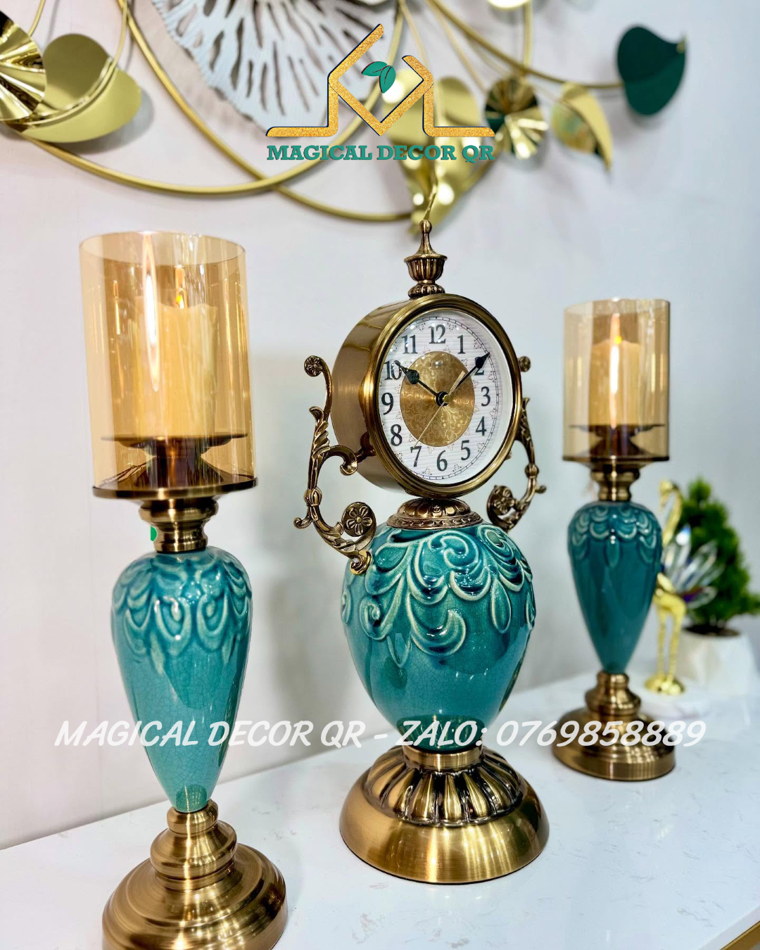 Set Đồng Hồ Chân Nến Xanh Hoa Văn