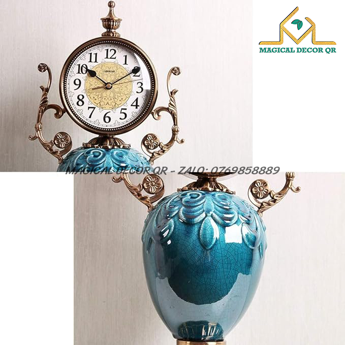 Đồng hồ được thiết kế theo phong cách bán cổ điển, với phần thân sứ xanh ngọc nổi bật, kết hợp cùng khung kim loại chạm khắc mềm mại. Mặt đồng hồ rõ nét, kim chuyển động êm ái – vừa là vật phẩm trang trí vừa mang tính ứng dụng cao.