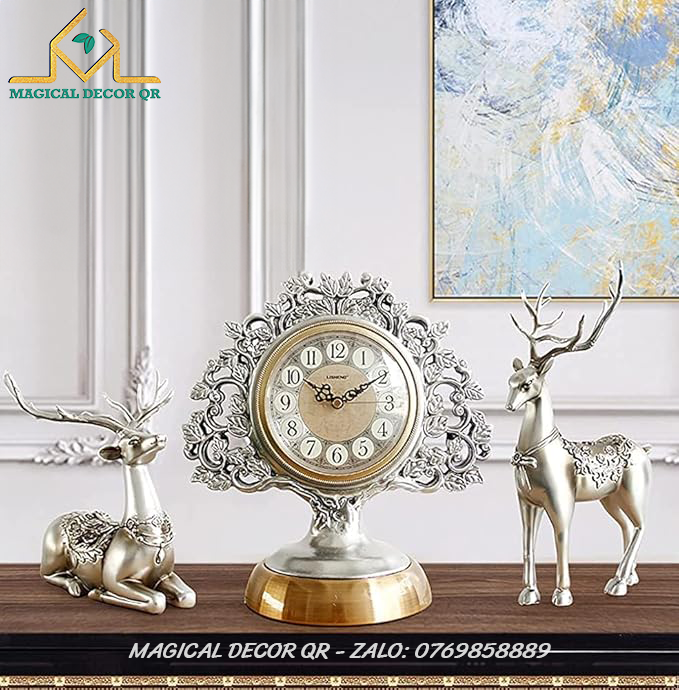 Set Đồng Hồ Hình Cây Hươu Trắng là sự hòa quyện tinh tế giữa đồng hồ nghệ thuật và tượng hươu trang trí sang trọng. Lấy cảm hứng từ vẻ đẹp thanh khiết của rừng phương Bắc, sản phẩm gây ấn tượng với thiết kế đồng hồ cây hoa cách điệu phối cùng cặp hươu bạc sang trọng – biểu tượng của sự sung túc, may mắn và thịnh vượng.