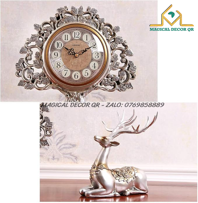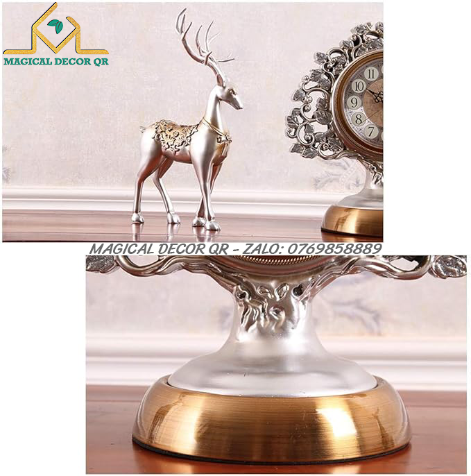 Phần đồng hồ được chế tác từ chất liệu resin cao cấp phủ ánh bạc sang trọng, chi tiết lá hoa đan xen mềm mại, tinh xảo, tôn lên vẻ cổ điển pha lẫn nét hiện đại. Tượng hươu đi kèm với đường nét uyển chuyển, thần thái thanh lịch, mang đến nguồn năng lượng an lành, thu hút tài lộc cho không gian sống.