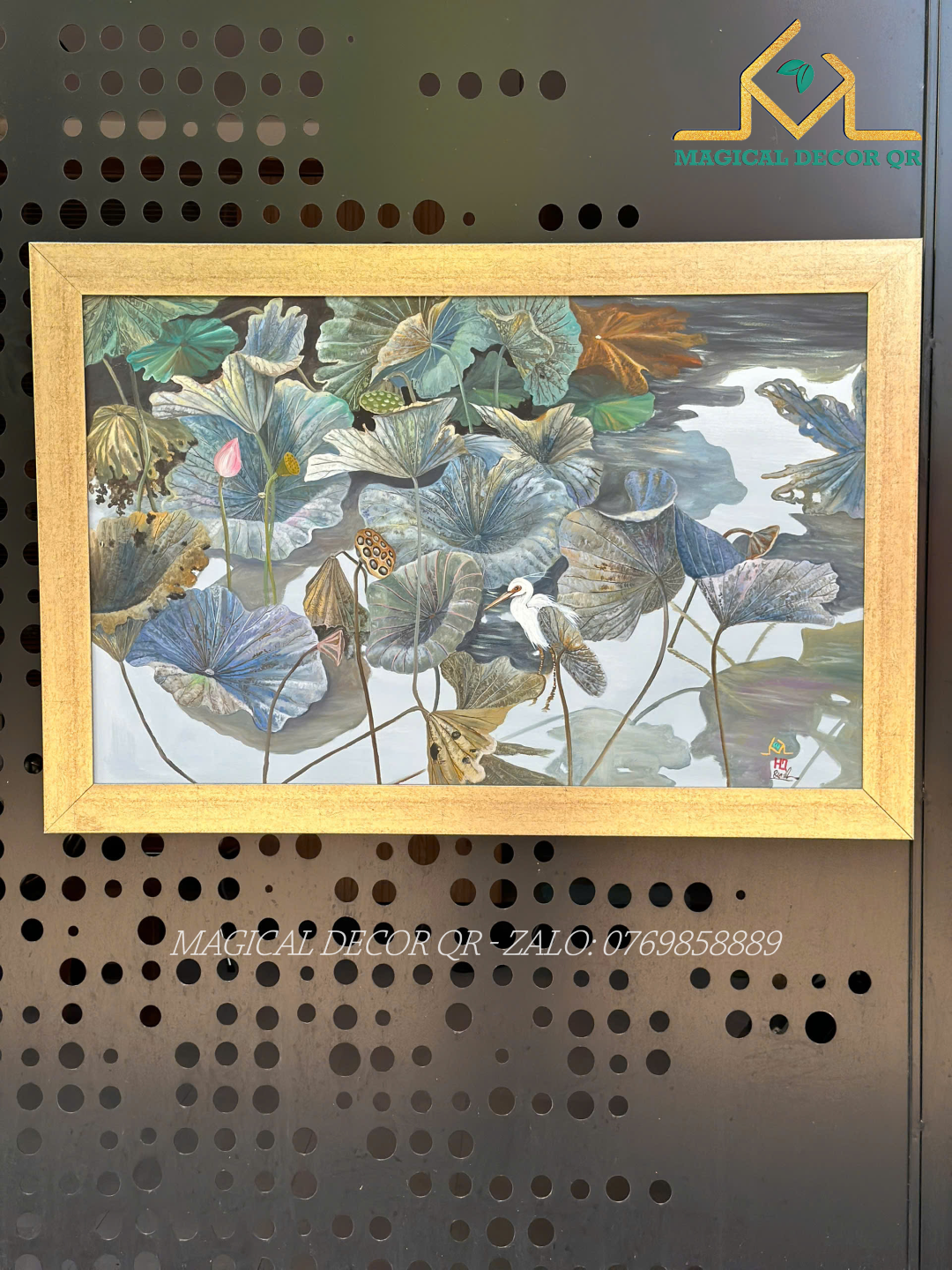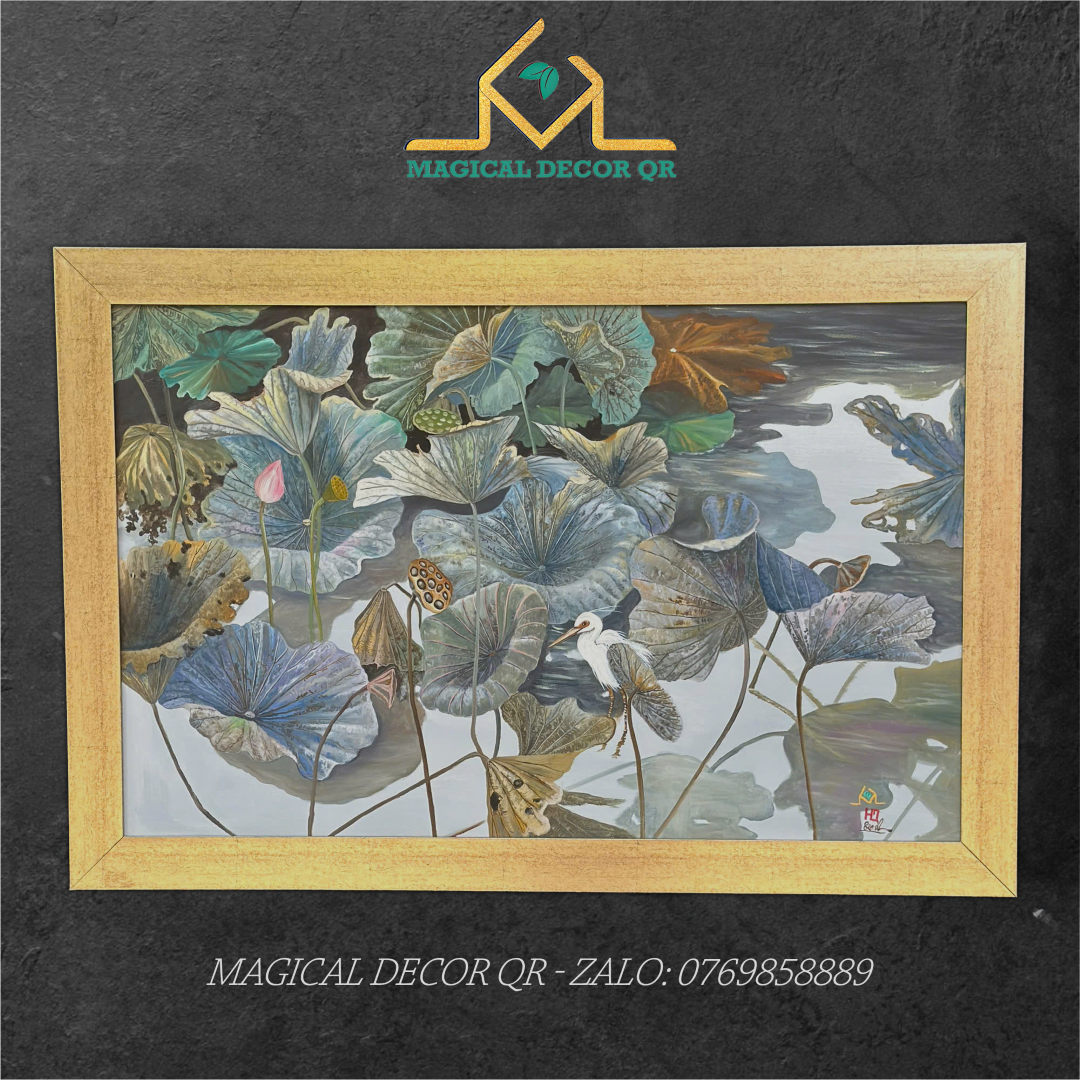 Tranh Sen Hạc Trắng không chỉ là một bức tranh, mà là một khúc thiền họa nhẹ nhàng, nơi thiên nhiên và tâm hồn giao hòa trong sự tĩnh lặng sâu sắc. Bức tranh mở ra một khung cảnh đầm sen yên bình, nơi những lá sen chuyển sắc thời gian – từ xanh non đến nâu úa – đan xen thành một bản hòa ca đầy cảm xúc. Nổi bật giữa khung cảnh ấy là dáng hình thanh tao của hạc trắng – biểu tượng của sự thanh cao, trường thọ và thuần khiết.