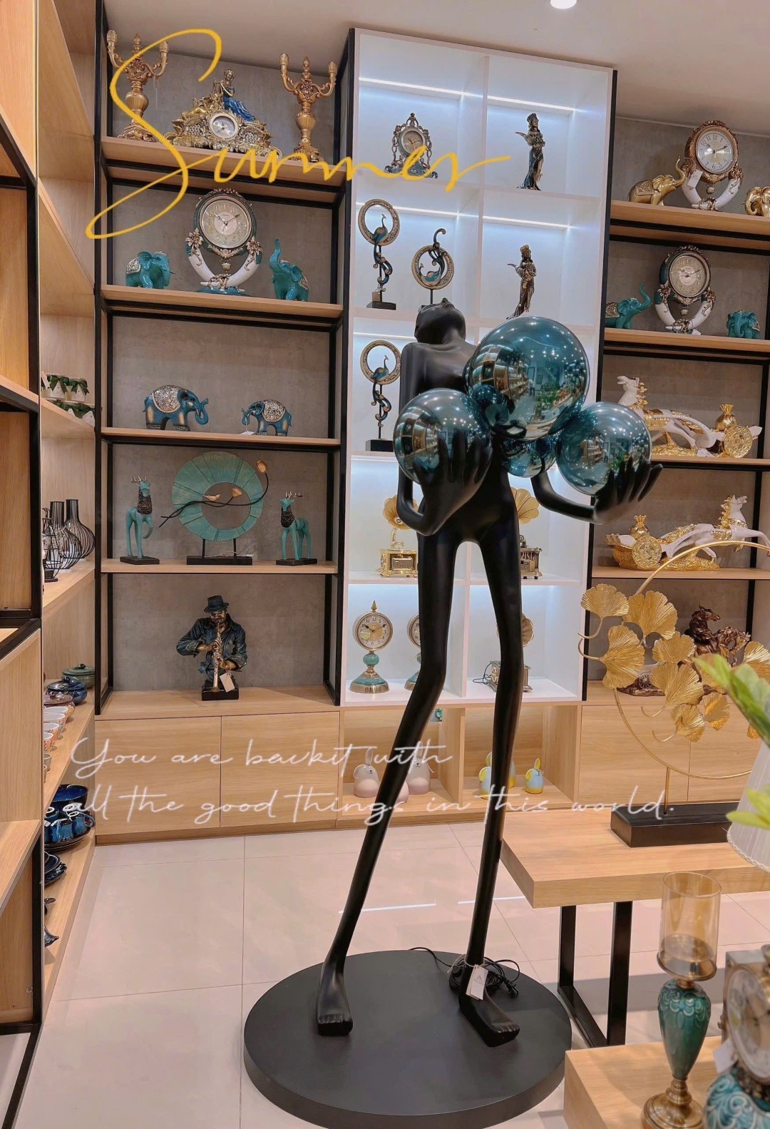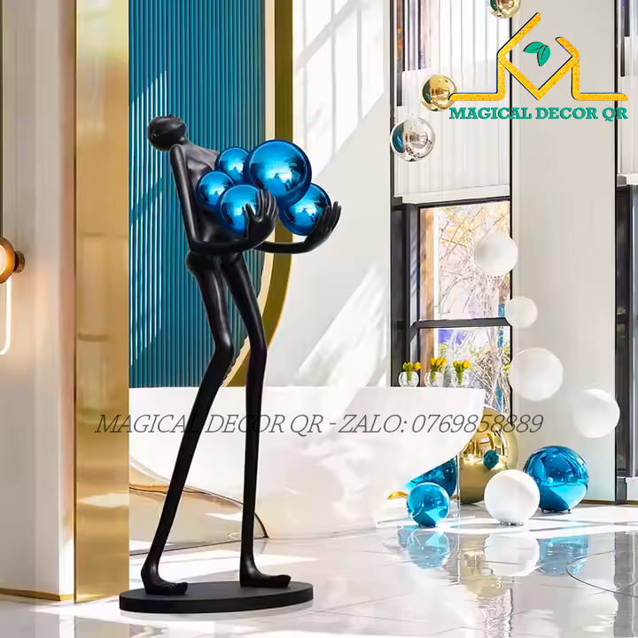 Tượng Đen Ôm Bóng Xanh là tác phẩm decor mang đậm tinh thần nghệ thuật đương đại, nổi bật với hình dáng trừu tượng cùng cụm cầu ánh sáng sống động. Với tạo hình người nghệ sĩ cách điệu, đôi tay dài nâng niu những quả cầu ánh sáng xanh rực rỡ, sản phẩm gợi mở sự cân bằng giữa sức mạnh nội lực và vẻ đẹp tinh tế.