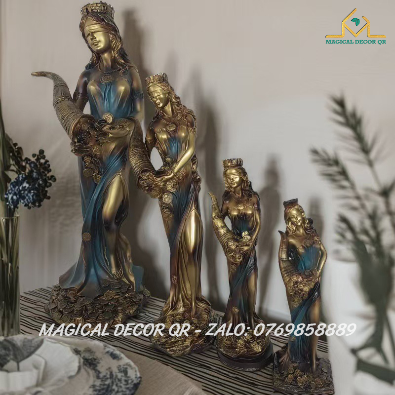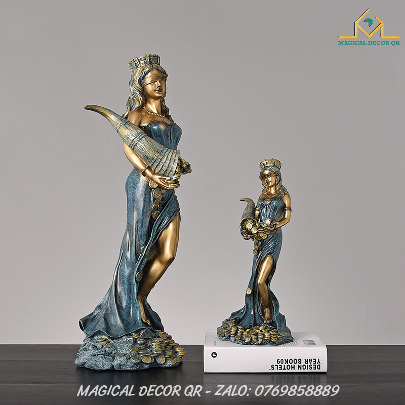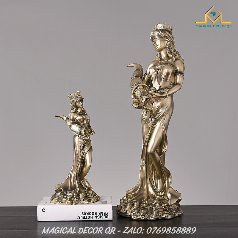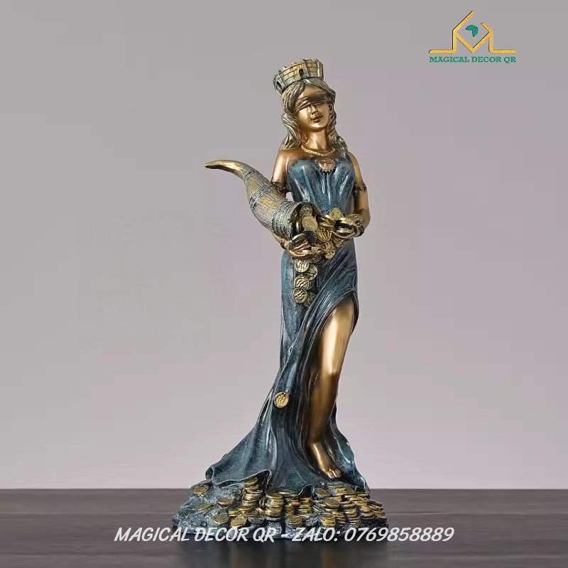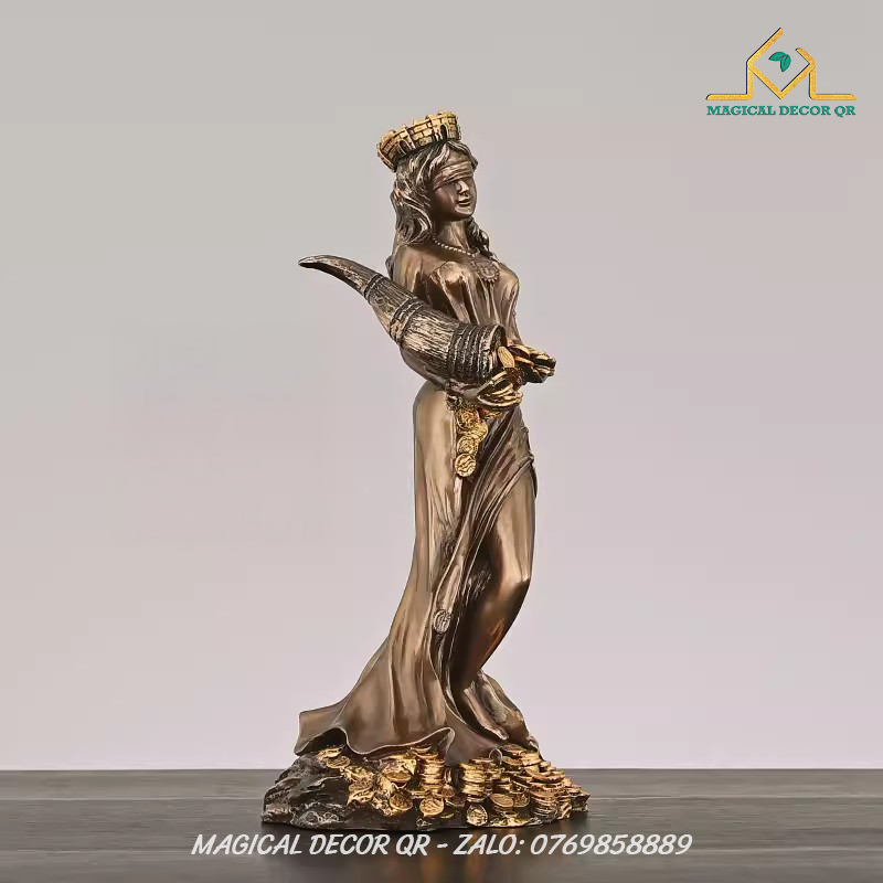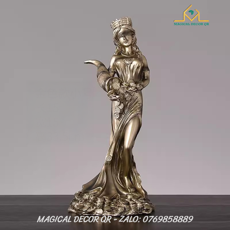 Tượng Nữ Thần Giàu Có Tyche là biểu tượng tuyệt đẹp mang đậm hơi thở thần thoại Hy Lạp, tôn vinh vẻ đẹp sung túc, thịnh vượng và may mắn. Lấy cảm hứng từ vị thần Tyche – Nữ Thần May Mắn của gia sản và vận mệnh – bức tượng được chế tác tinh xảo, tái hiện hình ảnh nữ thần đội vương miện thành, tay nâng chiếc sừng sung túc tuôn tràn những đồng vàng, lúa mì và của cải phồn vinh.