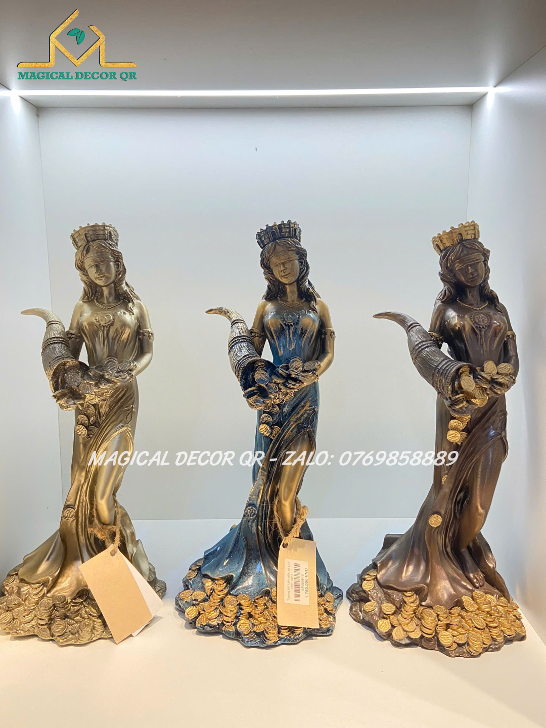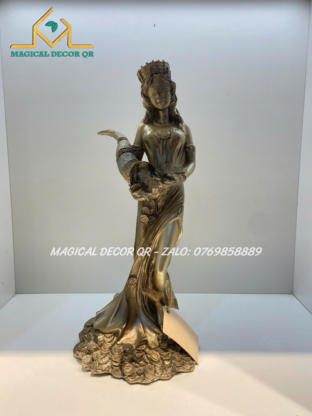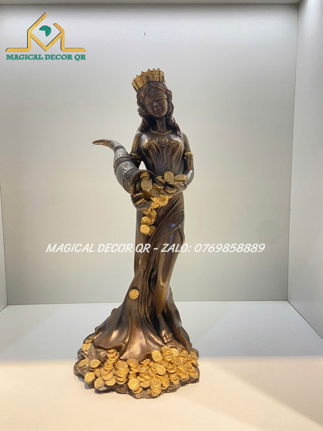 Tượng Nữ Thần Giàu Có Tyche là biểu tượng tuyệt đẹp mang đậm hơi thở thần thoại Hy Lạp, tôn vinh vẻ đẹp sung túc, thịnh vượng và may mắn. Lấy cảm hứng từ vị thần Tyche – Nữ Thần May Mắn của gia sản và vận mệnh – bức tượng được chế tác tinh xảo, tái hiện hình ảnh nữ thần đội vương miện thành, tay nâng chiếc sừng sung túc tuôn tràn những đồng vàng, lúa mì và của cải phồn vinh.