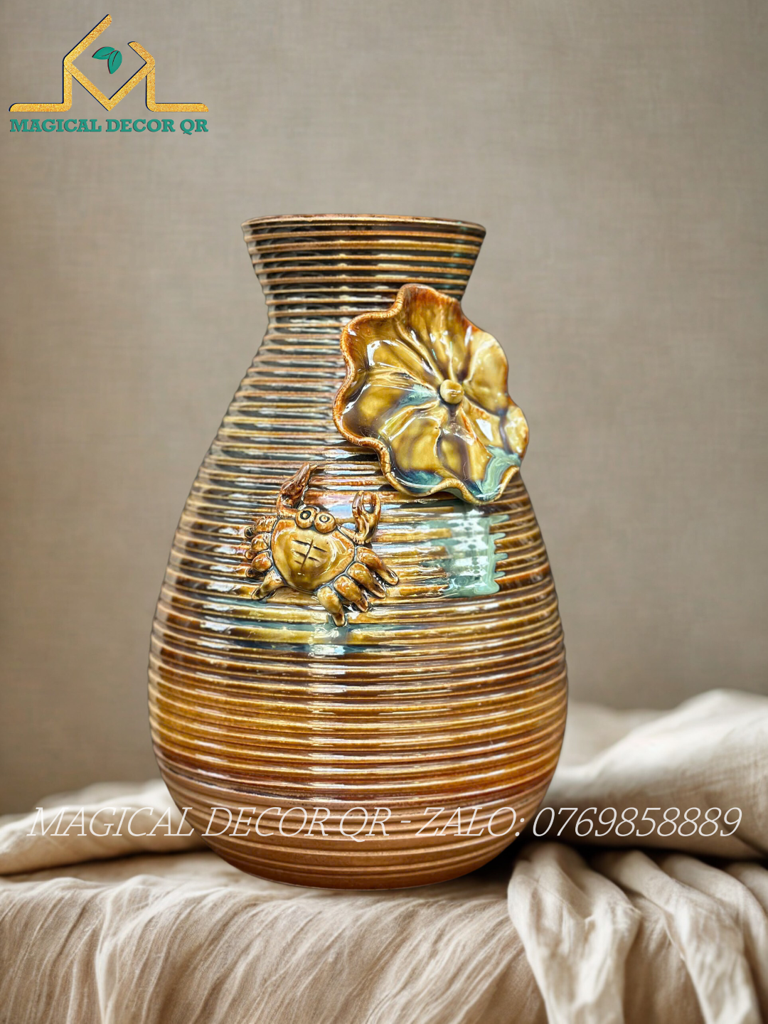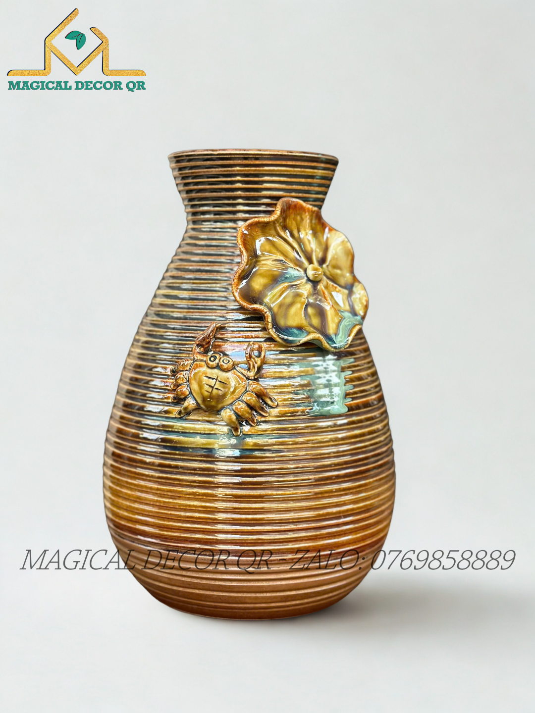 Được chế tác hoàn toàn thủ công bởi các nghệ nhân làng gốm Bát Tràng lâu đời, mỗi chiếc bình là một tác phẩm độc bản mang đậm dấu ấn cá nhân. Họa tiết đắp nổi tinh xảo kết hợp với lớp men sâu màu – kết quả của quá trình nung nhiều lớp ở nhiệt độ cao – tạo nên vẻ đẹp cổ điển, bền chắc và cảm giác "nặng tay" đặc trưng của gốm cao cấp.