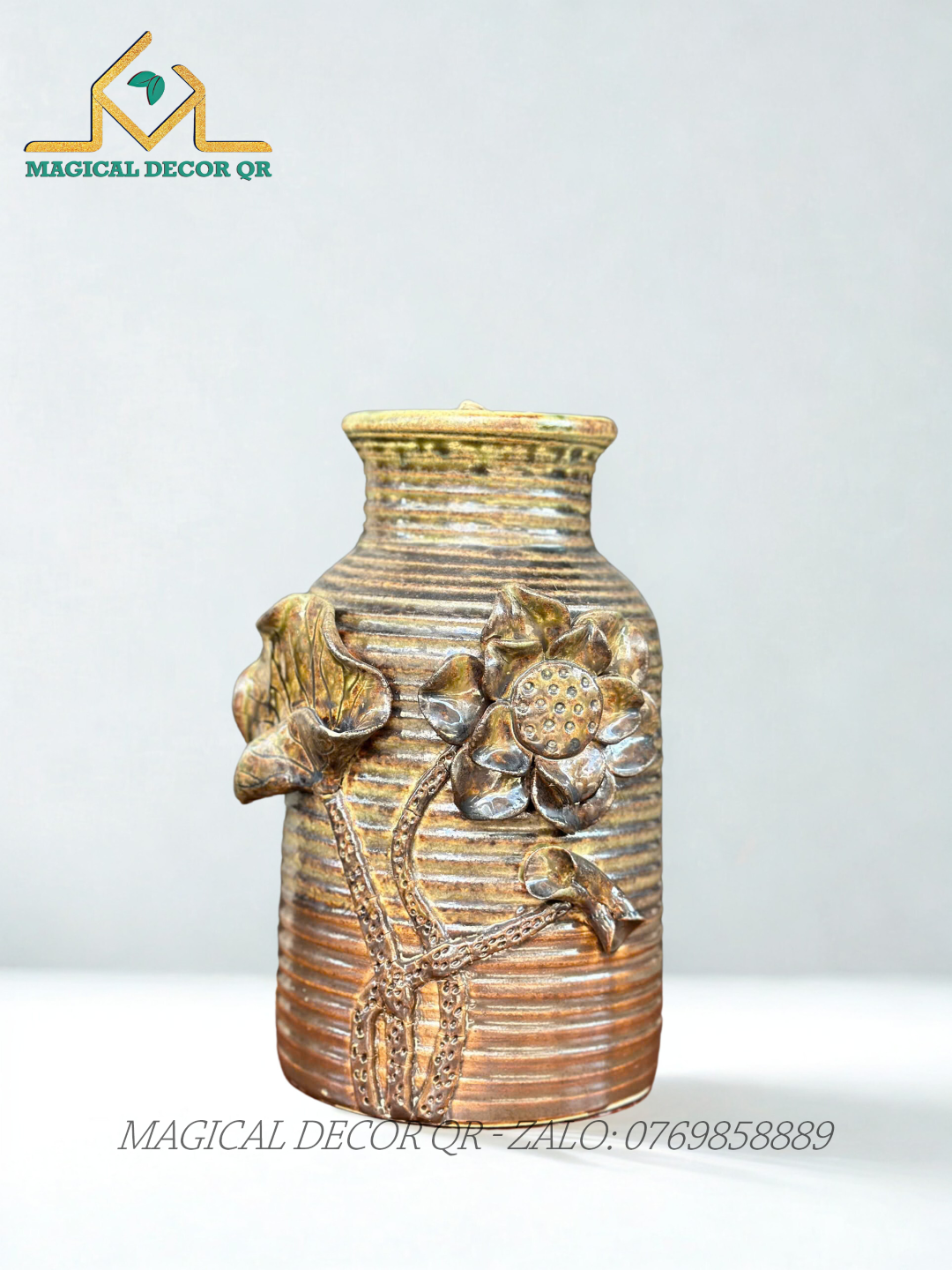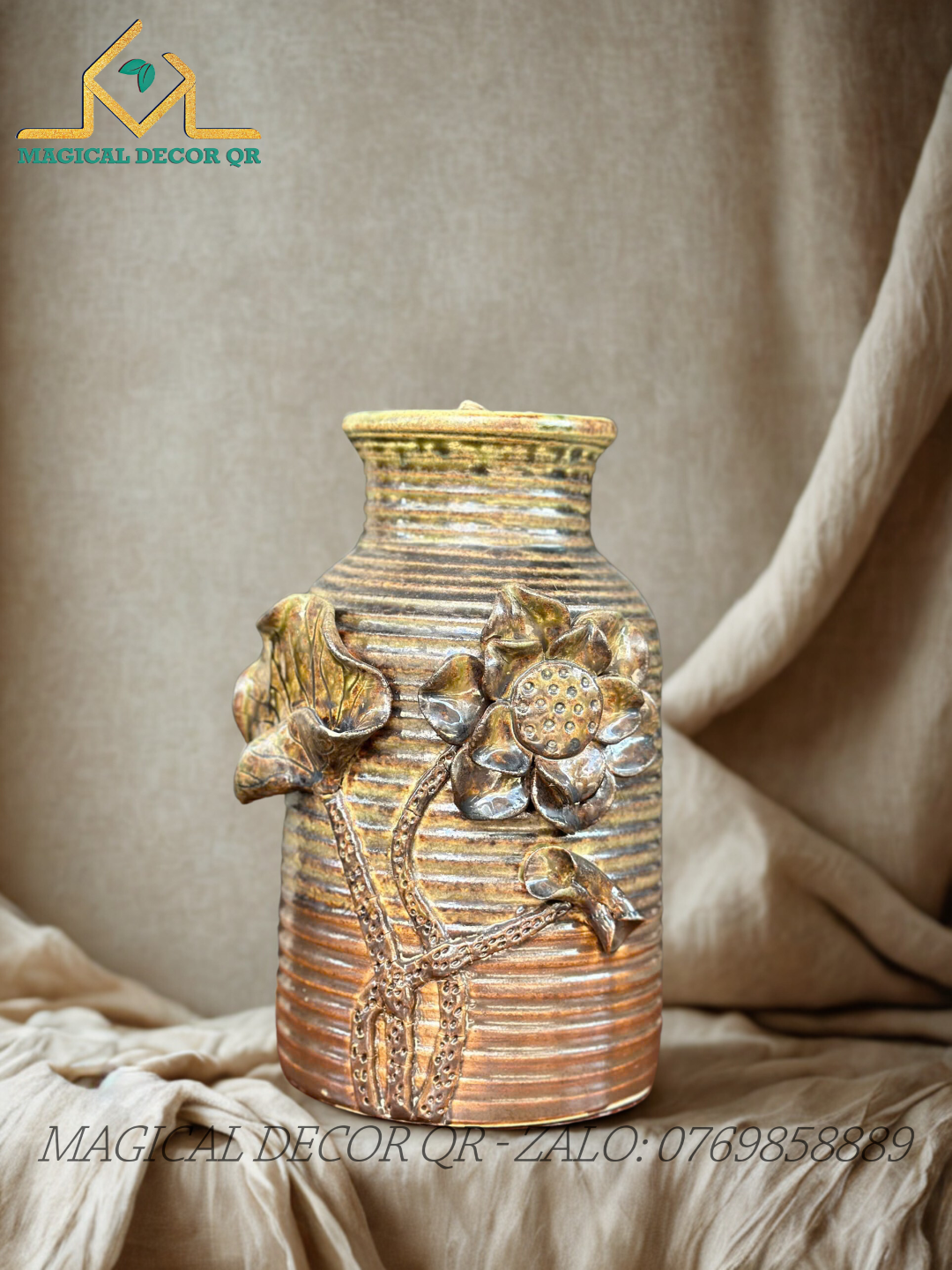 Được chế tác hoàn toàn thủ công bởi các nghệ nhân làng gốm Bát Tràng lâu đời, mỗi chiếc bình là một tác phẩm độc bản mang đậm dấu ấn cá nhân. Họa tiết đắp nổi tinh xảo kết hợp với lớp men sâu màu – kết quả của quá trình nung nhiều lớp ở nhiệt độ cao – tạo nên vẻ đẹp cổ điển, bền chắc và cảm giác "nặng tay" đặc trưng của gốm cao cấp.
