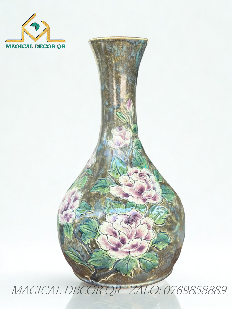 Được chế tác hoàn toàn thủ công bởi các nghệ nhân làng gốm Bát Tràng danh tiếng, mỗi chiếc bình là một tác phẩm độc bản mang đậm dấu ấn cá nhân. Hình dáng được tạo nên qua kỹ thuật vuốt tay truyền thống, tạo nên đường nét mềm mại, tự nhiên và đầy tính nghệ thuật. Kết hợp với lớp men sâu màu – kết quả của quá trình nung nhiều lớp ở nhiệt độ cao – bình gốm mang vẻ đẹp cổ điển, bền chắc và cảm giác "nặng tay" đặc trưng của gốm cao cấp.